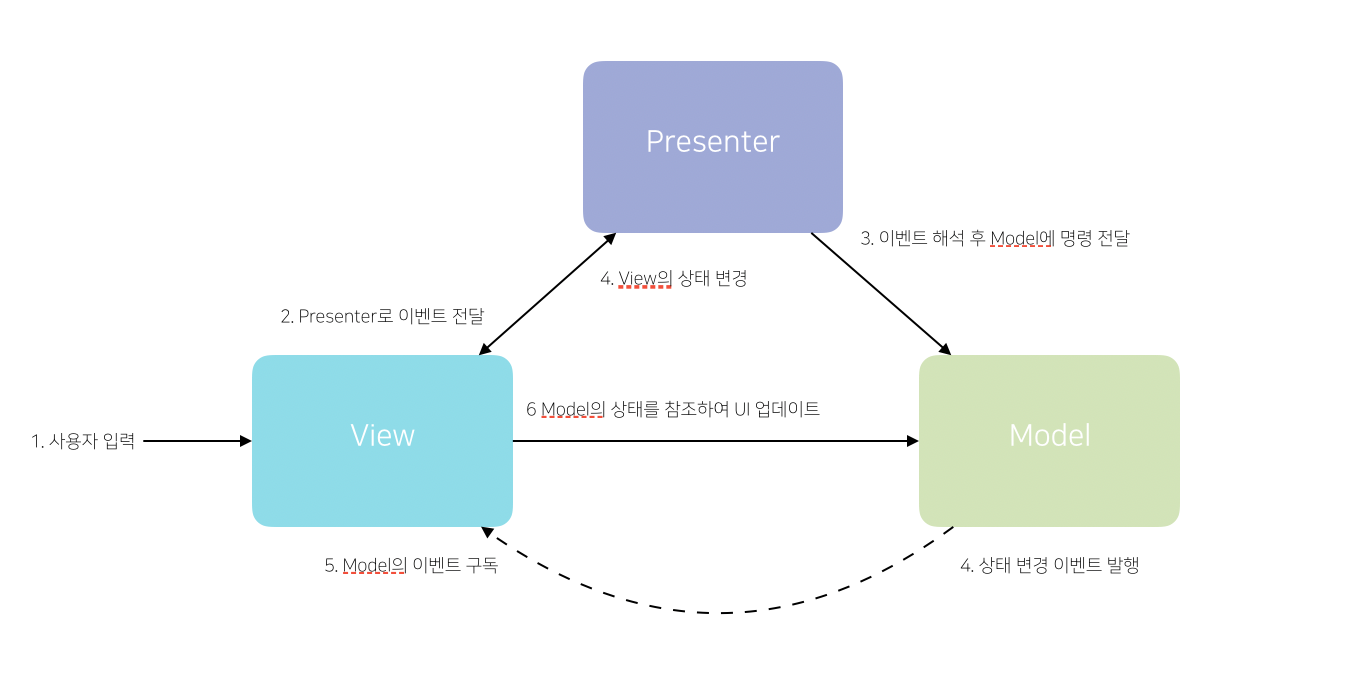 MVP는 이를 개선하고자 사용자의 입력을 View에서 처리하도록 하고, 불필요한 Controller 대신 Presenter 컴포넌트가 추가된 구조입니다.