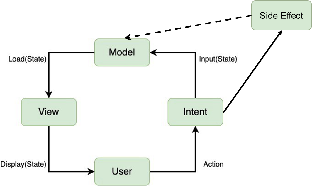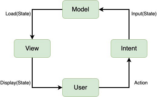 사용자의 입력이나 이벤트를 Intent로 묶어 Model에 전달하여, 데이터를 갱신하고, 다시 View에 표시하는 것으로 볼 수 있습니다.
