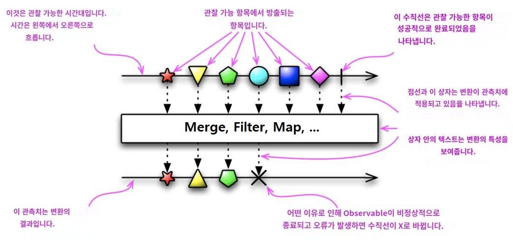 ReactiveX의 줄임말로, "비동기 프로그래밍을 위한 관찰 가능한 Stream API"라는 의미를 갖고 있으며,
