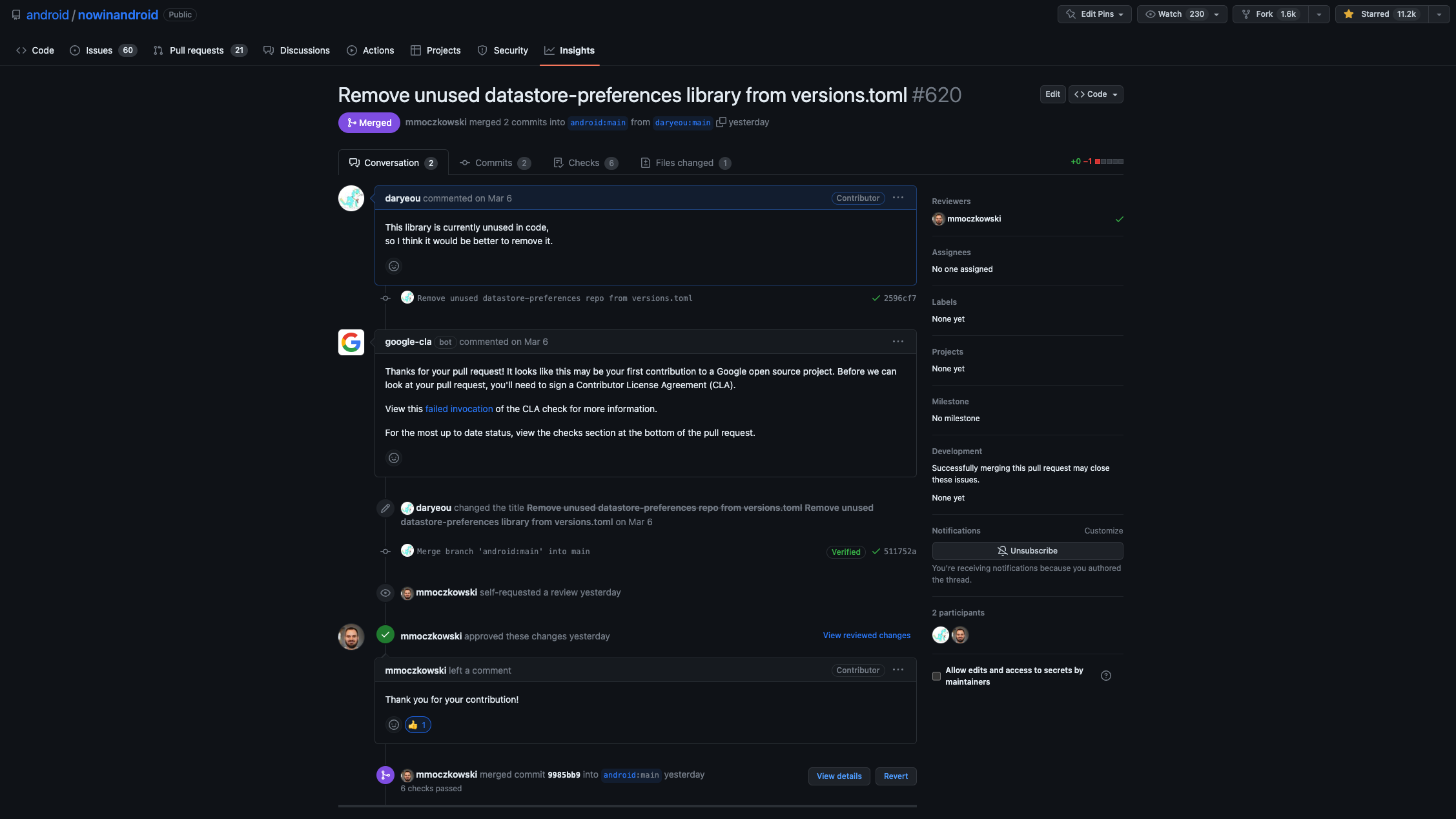불필요한 라이브러리가 선언되어 있어 한 줄 지우고 올렸던 것이었는데, 사소한 것이지만 생에 처음으로 오픈소스 프로젝트의 Contributor가 되었네요.