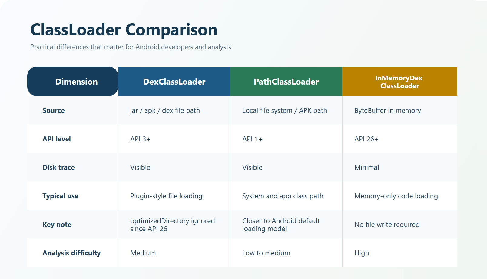 - InMemoryDexClassLoader는 흔적이 적고 런타임 의존성이 커서 분석 난도가 가장 높습니다.
