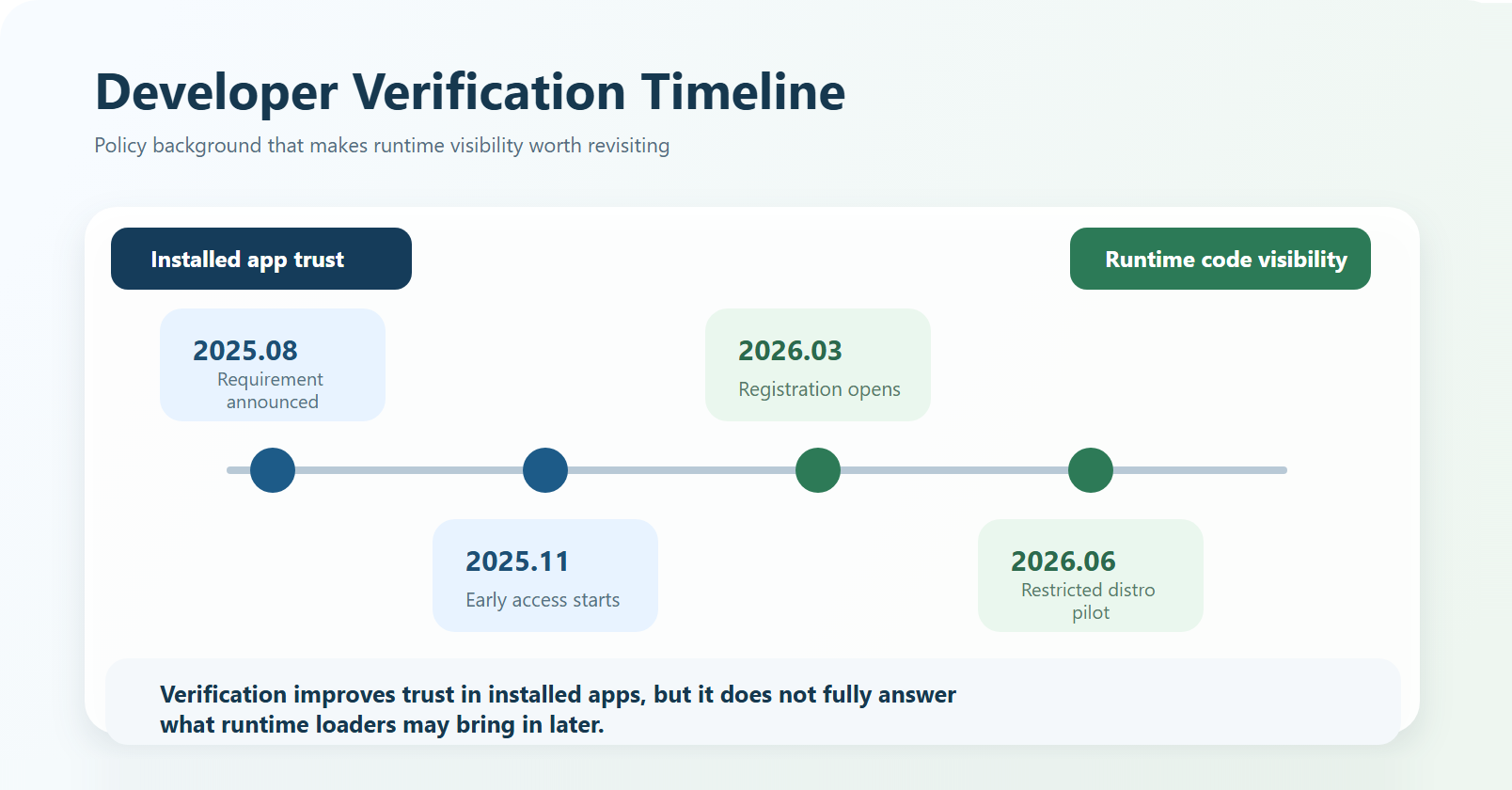 "앞으로 앱 설치 경로와 개발자 신뢰 체인이 더 강하게 묶이면, 런타임에는 어떤 코드가 실제로 실행되는지가 더 중요해지는 것 아닐까?"