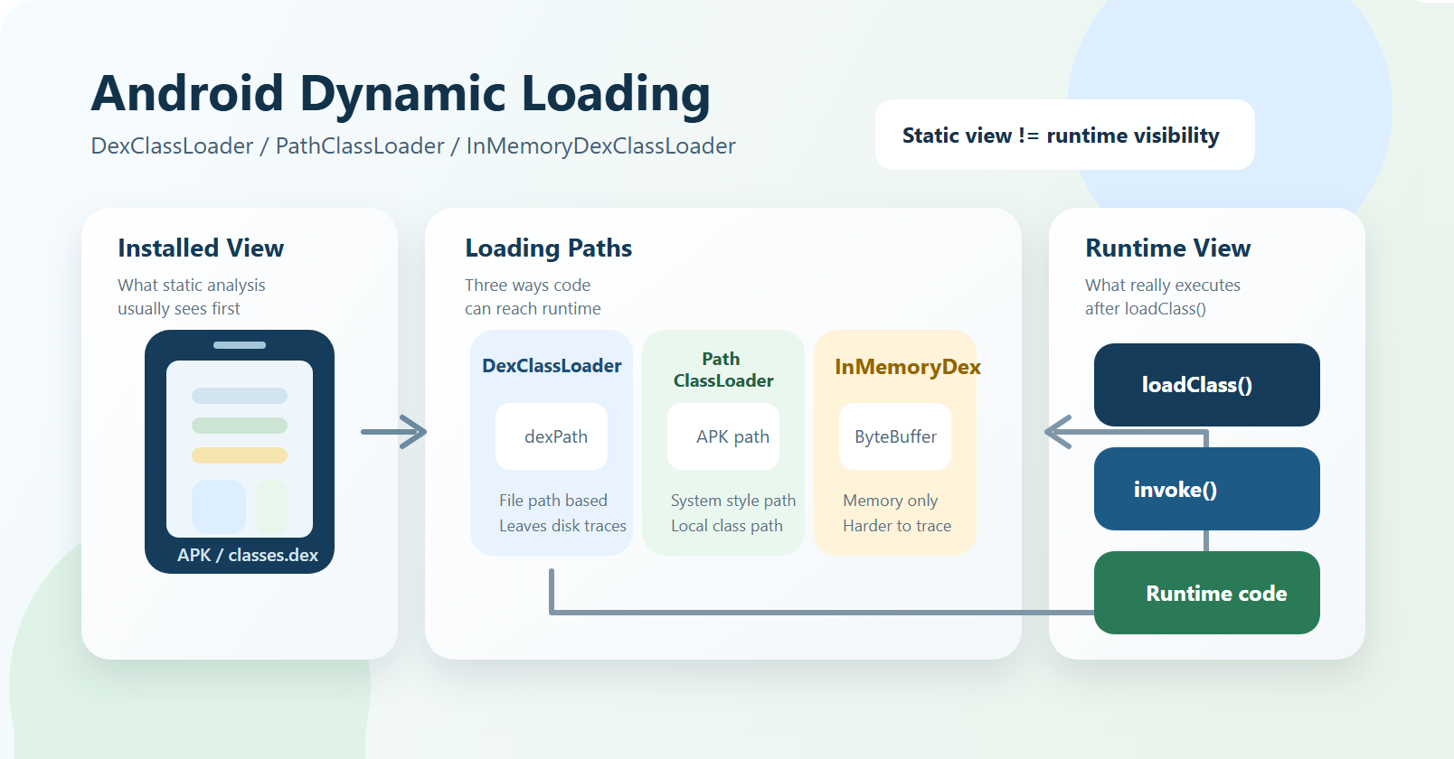 보안 분석 글에서도 이 지점이 반복해서 등장합니다. 최근 안드로이드 악성 앱은 정적 분석을 회피하기 위해 핵심 로직을 별도 DEX로 숨기고, 실행 시점에만 로드하는 패턴을 자주 사용합니다. 설치된 APK만 열어 봐서는 중요한 로직이 보이지 않게 만드는 것입니다.